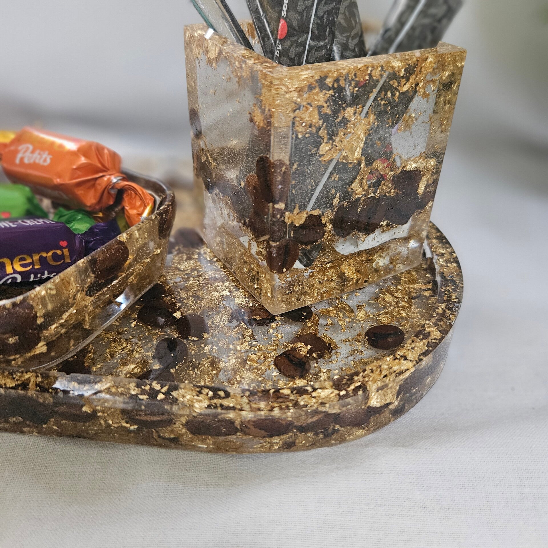 Super leuk platteu voor koffie. Gevuld met koffiebonen en goud vlokken.