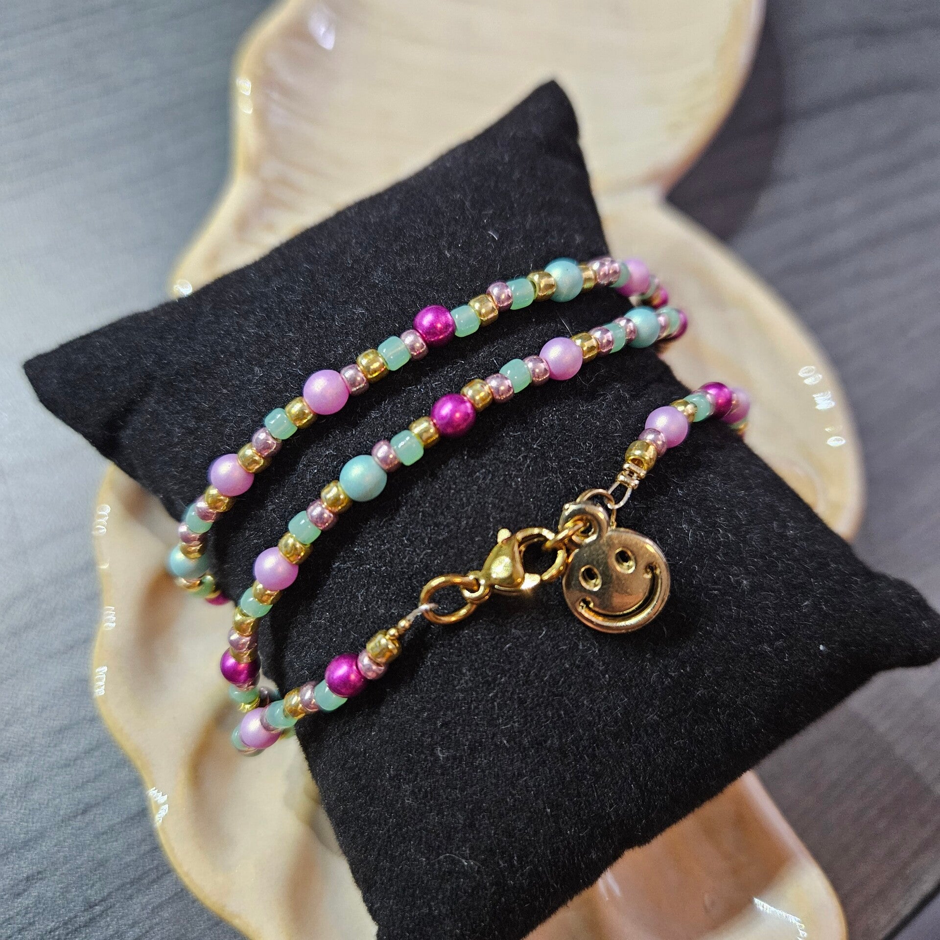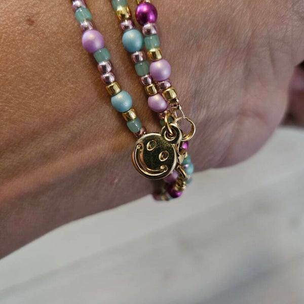 Deze armband kun je 3 keer om je pols wikkelen voor een speels en stijlvol effect. Hij is afgewerkt met een vrolijke smiley-bedel, een goud ion RVS-sluiting én gemaakt van kwaliteitskralen.