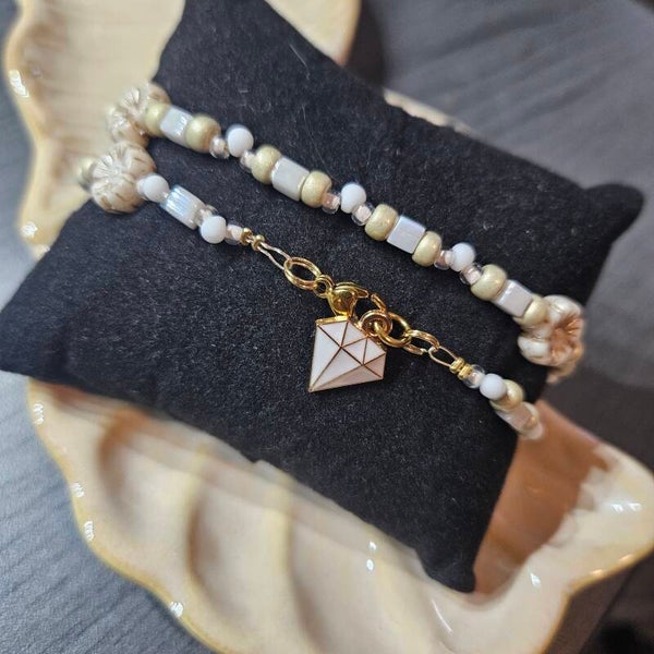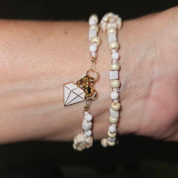 Deze prachtige, neutrale armband wikkel je twee keer om je pols voor een elegante look.Afgewerkt met een ion RVS-sluiting en een subtiel diamantbedeltje ✨ maximaal 18 cm pols